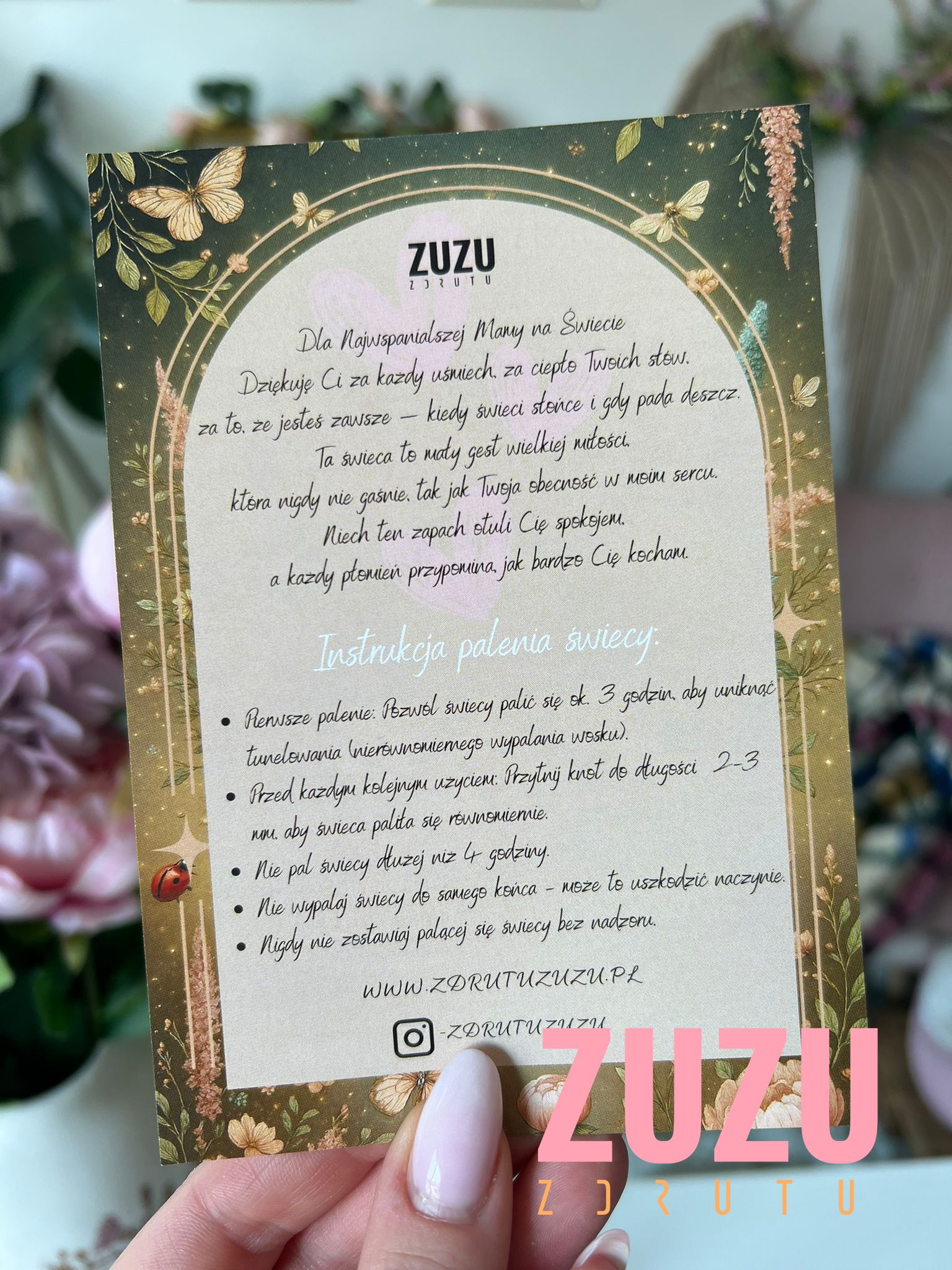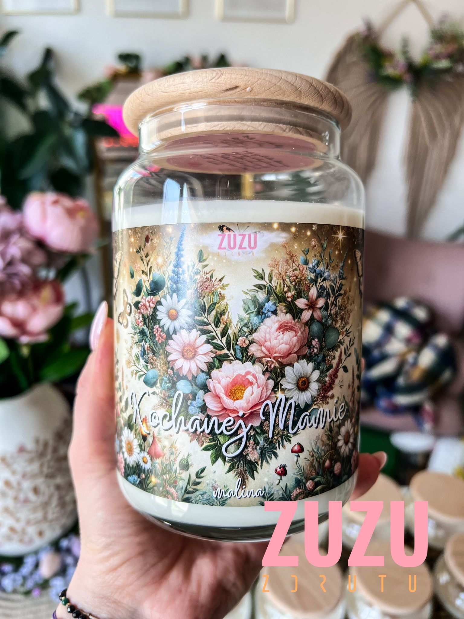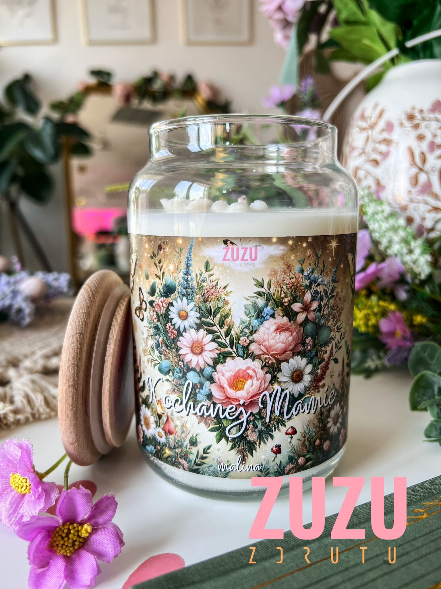 Na etykiecie świecy widnieje piękne serce ułożone z kwiatów oraz napis „Kochanej Mamie”, który dodaje wyjątkowego uroku. Co więcej, w środku boxu umieściliśmy również specjalną dedykację, która może wywołać uśmiech, wzruszenie, a czasem nawet łzy szczęścia.