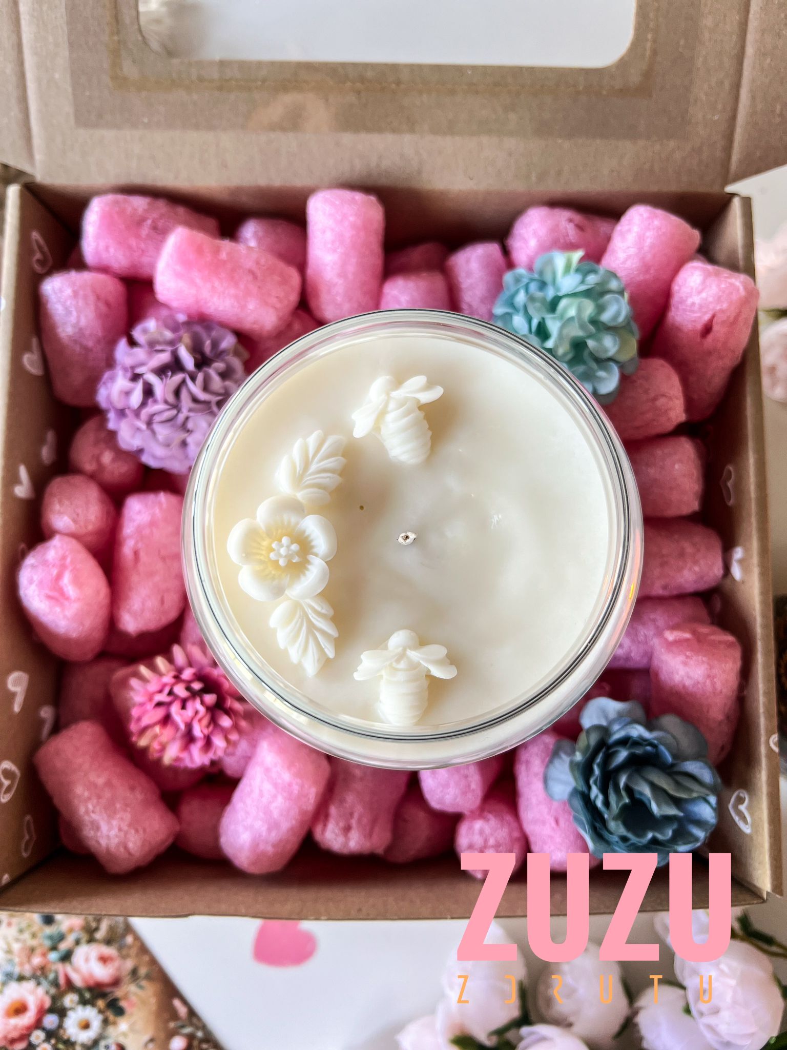 Świeca zapakowana jest w eleganckie pudełko w białe serduszka, dzięki czemu prezent nie wymaga dodatkowego pakowania. To praktyczne rozwiązanie, ale również estetyczne – całość prezentuje się zachwycająco od razu po otwarciu.