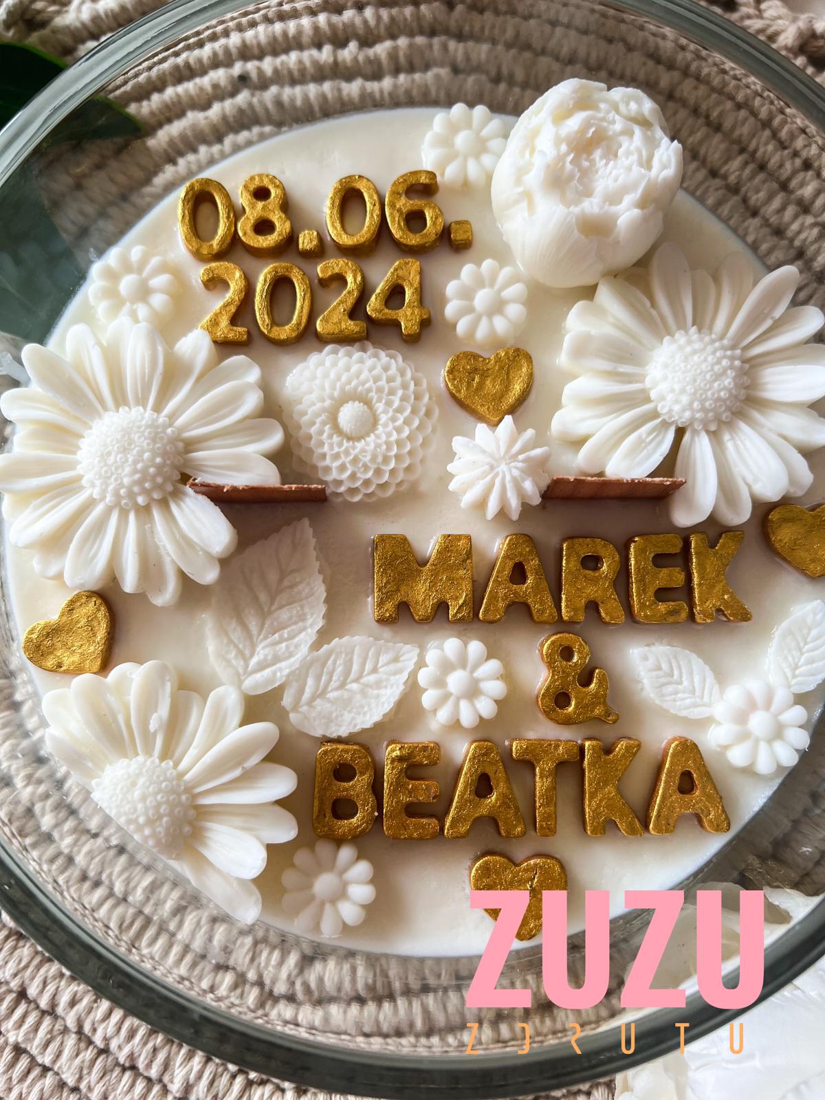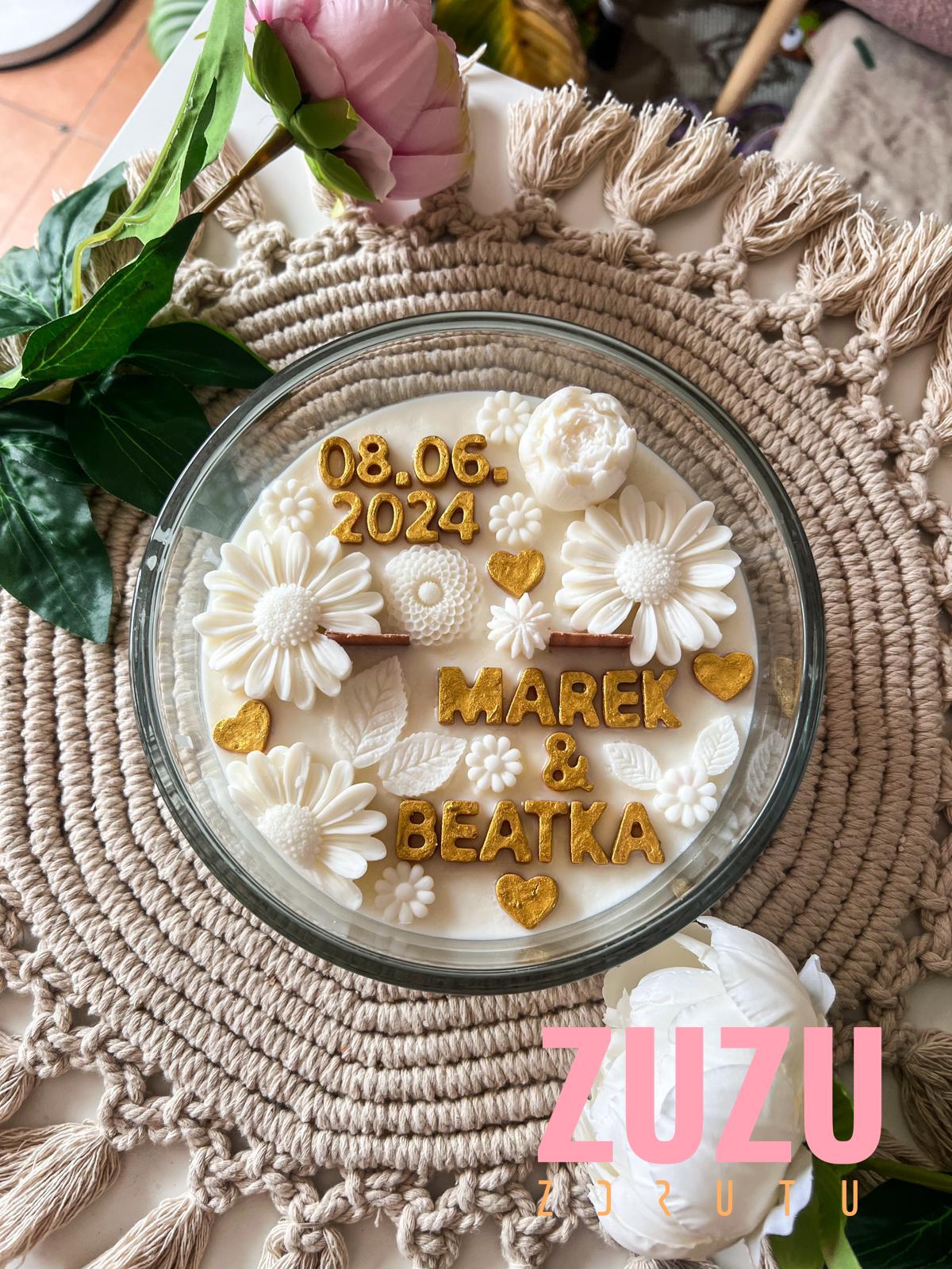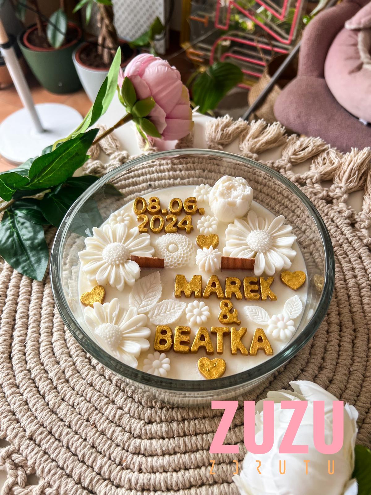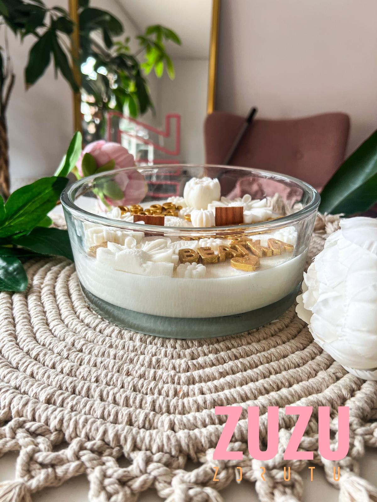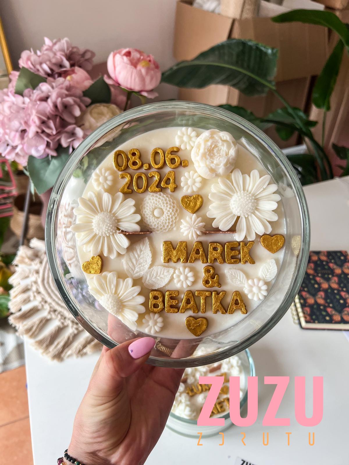 Ta wyjątkowa ręcznie robiona świeca sojowa to połączenie subtelnego piękna stokrotkowych dekoracji oraz elegancji złotych akcentów. Co wyróżnia tę świecę? Każda litera napisu jest ręcznie malowana specjalną farbą do świec w kolorze złotym, co dodaje jej niepowtarzalnego charakteru i wyjątkowości.