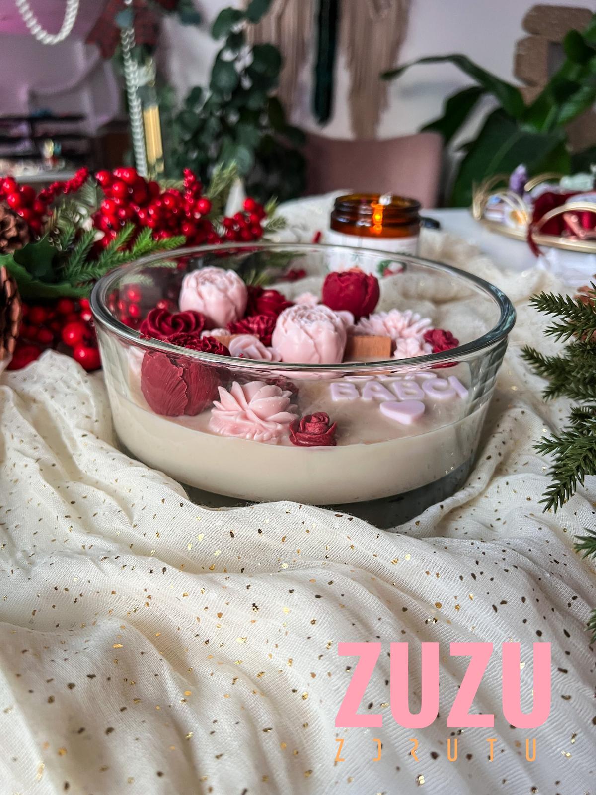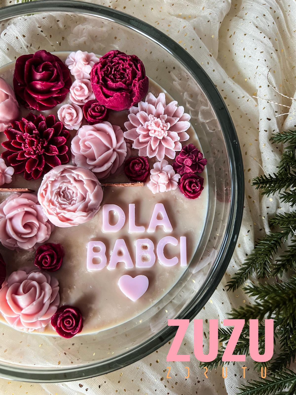 DUŻA ŚWIECA KWIATY BORDOWA-BRUDNY RÓŻ Z NAPISEM – Zachwyć swoich bliskich wyjątkowym prezentem lub dodaj do swojego domu odrobinę elegancji dzięki naszej ręcznie robionej świecy sojowej. Ta piękna świeca, zawierająca 600 g naturalnego wosku sojowego, przyciąga uwagę kwiatowymi dekoracjami w odcieniach bordowego i brudnego różu. Jej wyjątkowy design sprawia, że doskonale nadaje się na prezent na Dzień Matki, urodziny lub inne ważne okazje.