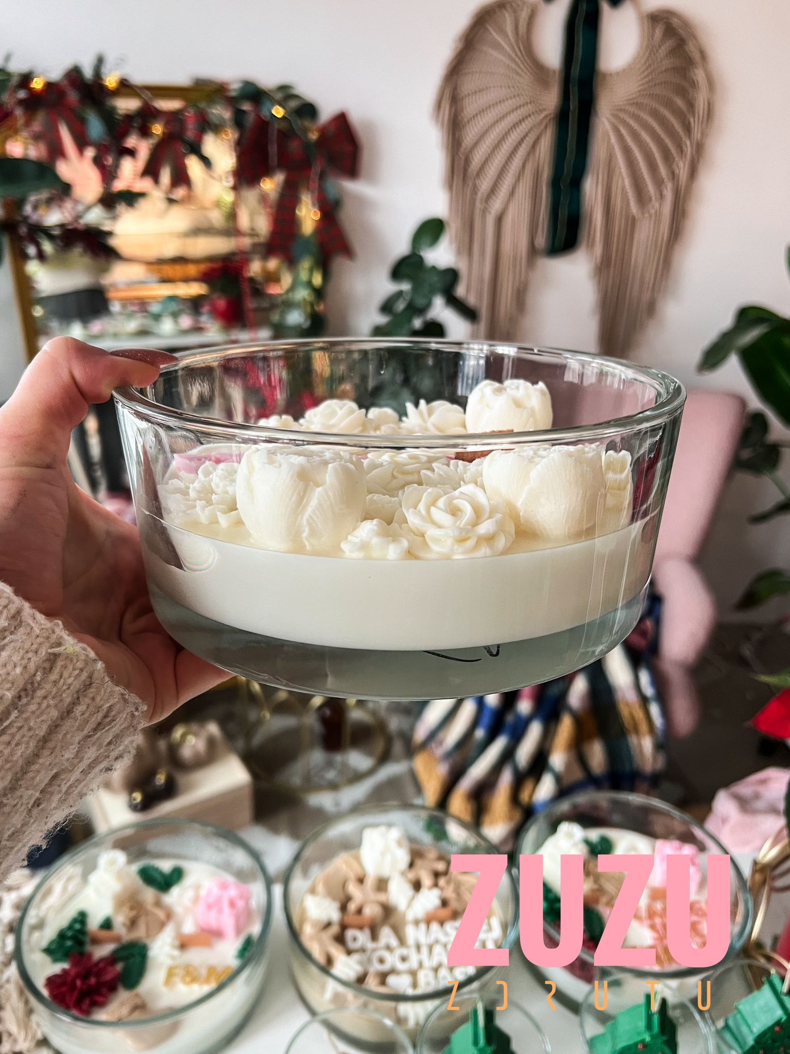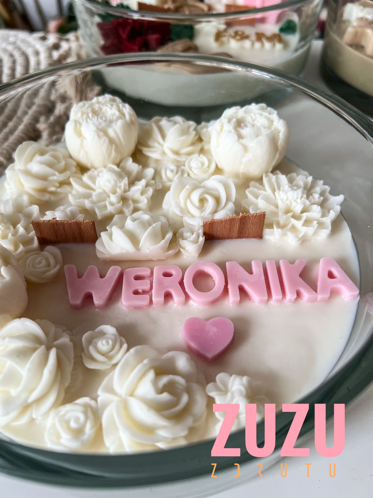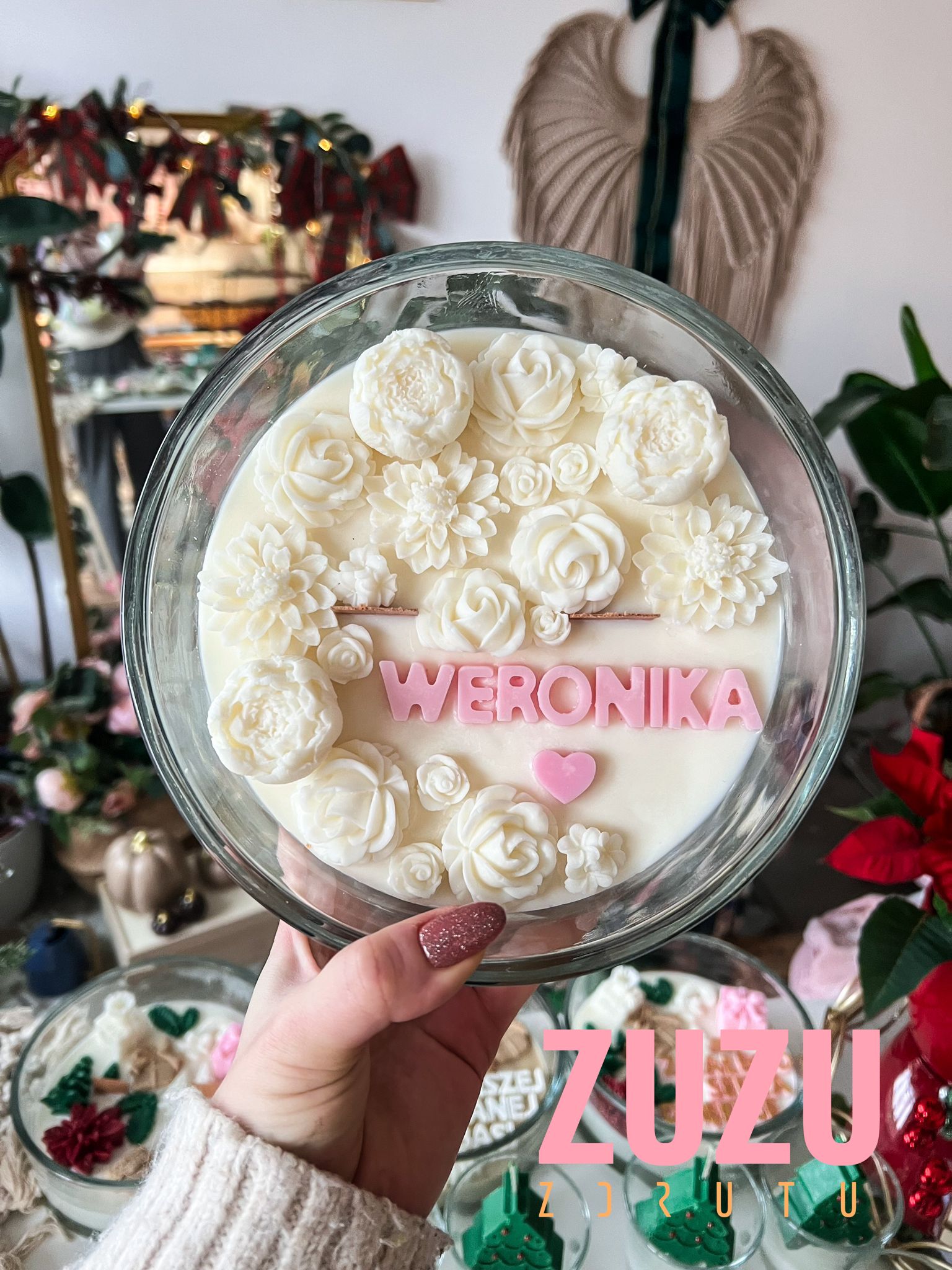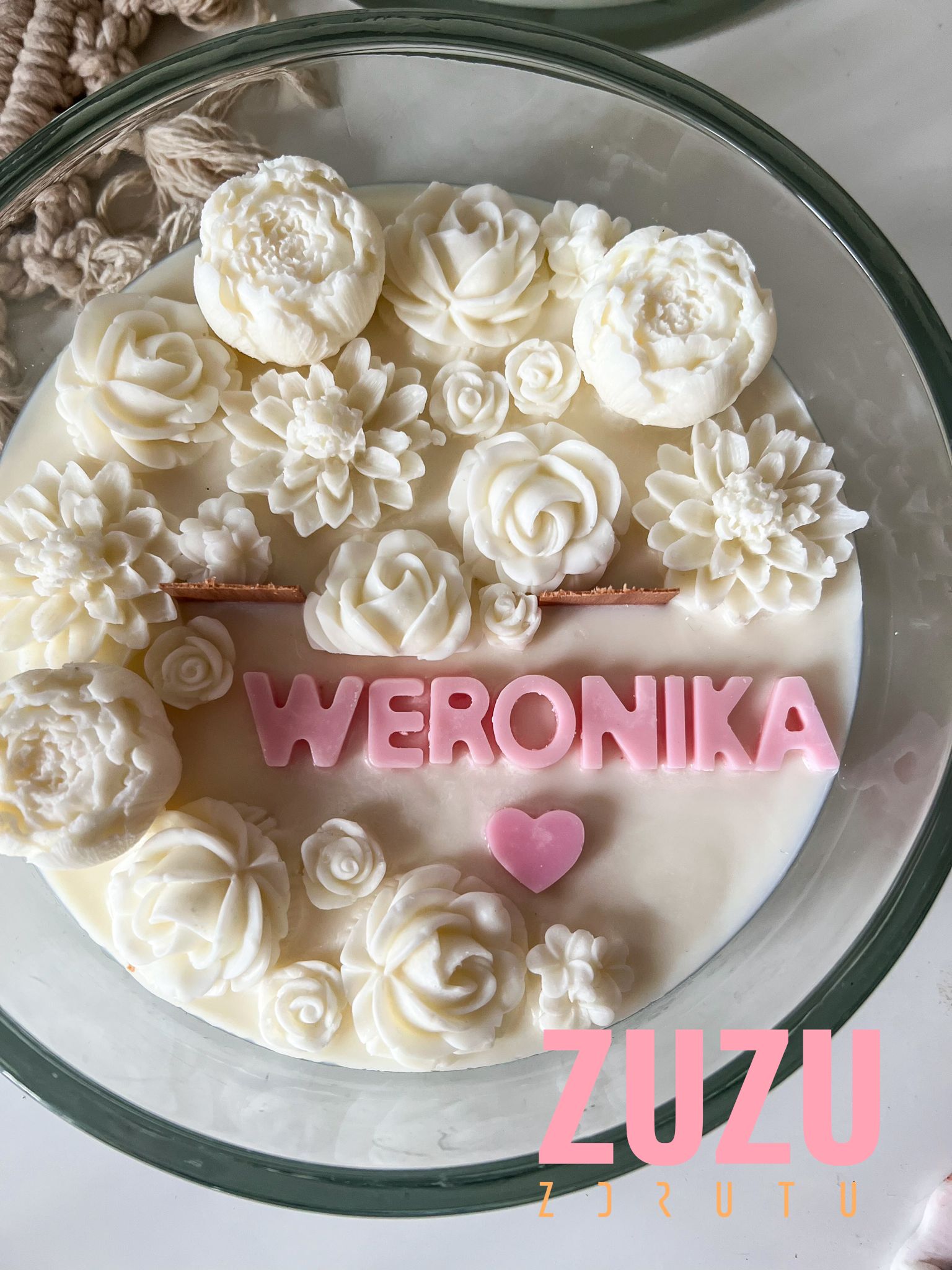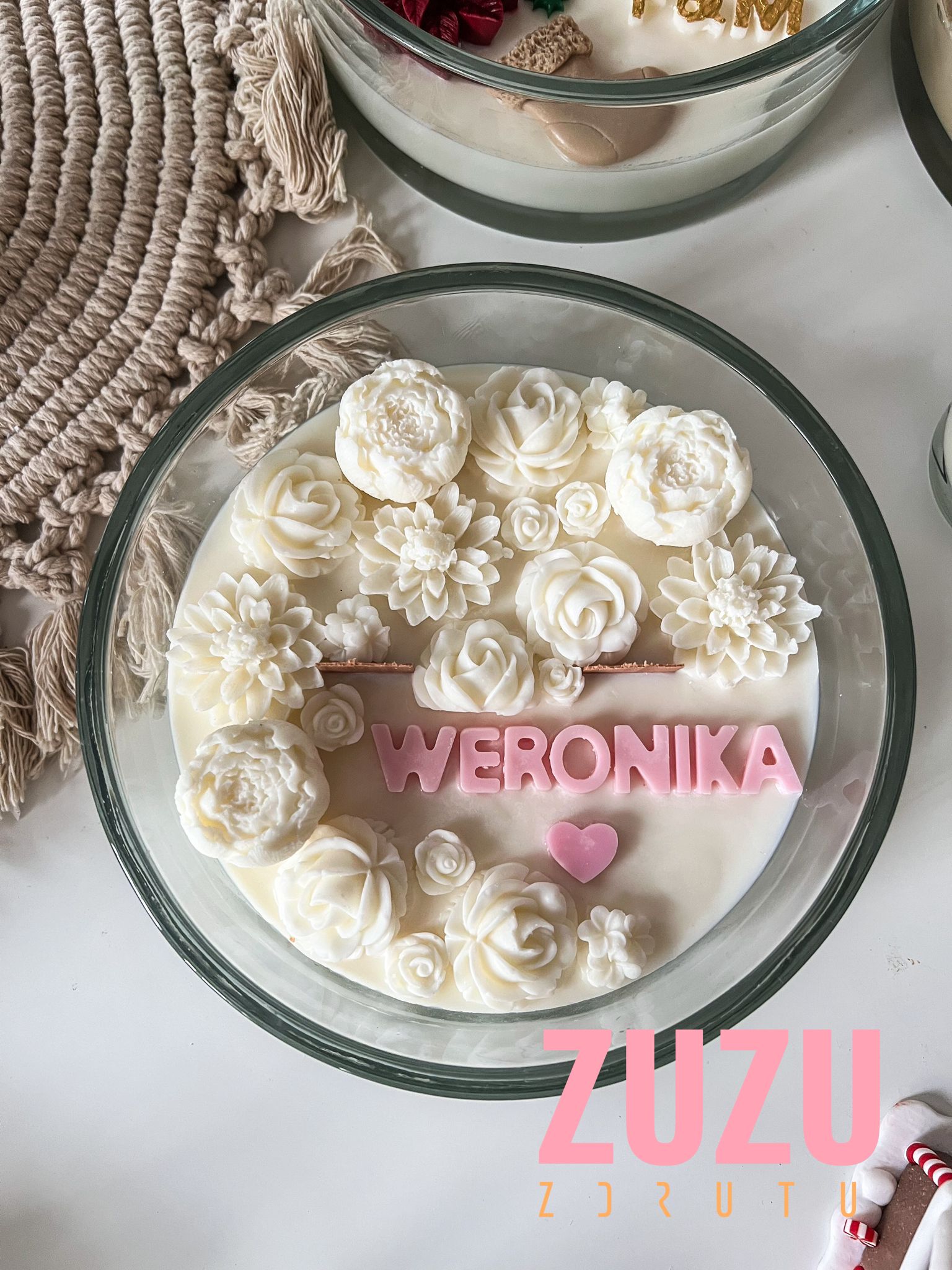 Duża świeca kwiaty – Przedstawiamy pierwszą dużą kwiatową świecę, która stała się znakiem rozpoznawczym ZdrutuZuzu! Ten wyjątkowy wzór to jedna z pierwszych kwiatowych świec wprowadzonych przez nas na polski rynek, tym razem w naturalnej odsłonie, co czyni ją prawdziwym symbolem naszej marki. Ręcznie wykonana z najwyższą starannością, świeca sojowa zachwyca subtelnymi kwiatowymi dekoracjami oraz możliwością personalizacji, dzięki której możesz stworzyć coś naprawdę unikalnego.