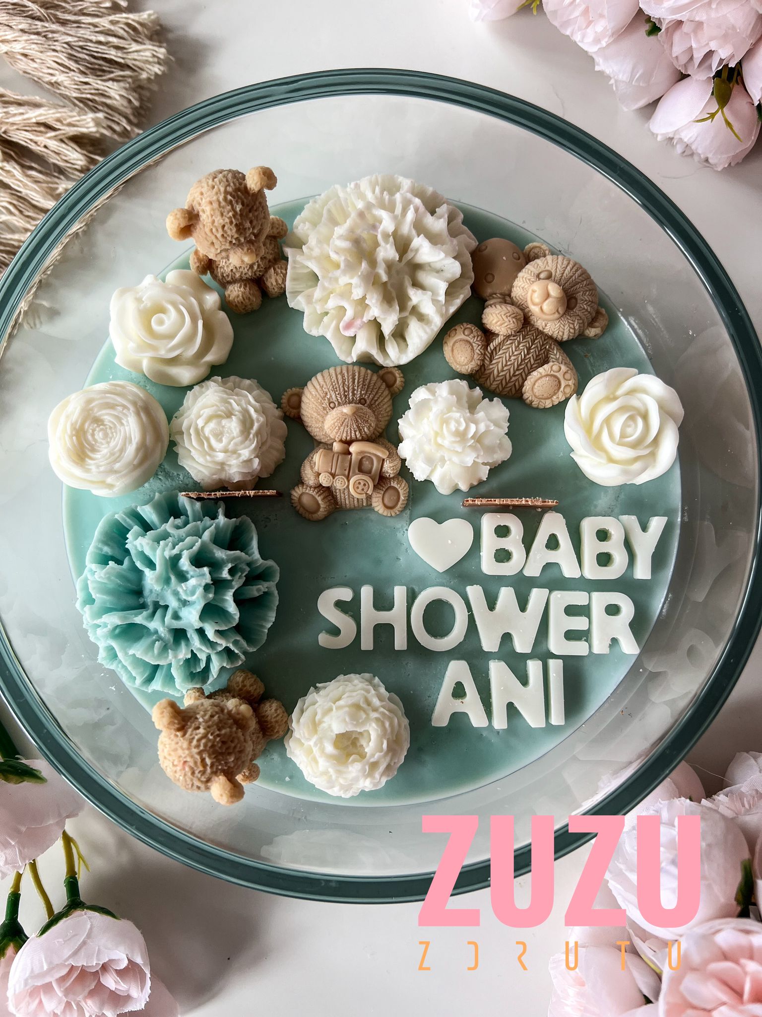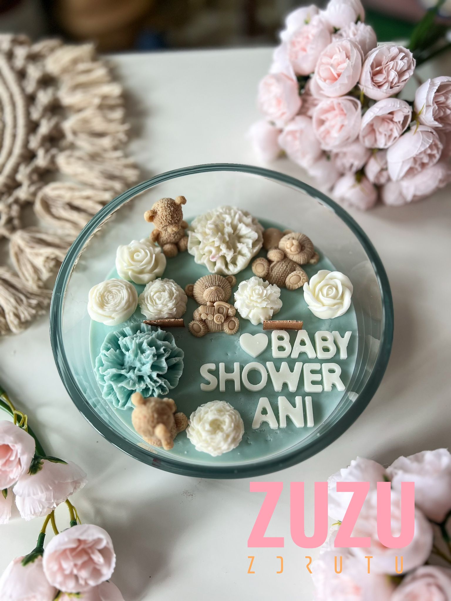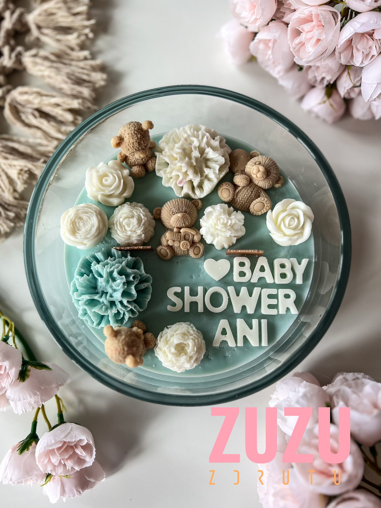 DUŻA ŚWIECA MISIE RÓŻ Z NAPISEM to ręcznie wykonana dekoracyjna świeca, która zachwyca uroczymi detalami i możliwością pełnej personalizacji. To idealny wybór na prezent dla przyszłej mamy, bliskiej przyjaciółki lub kogoś, komu chcesz podarować wyjątkowy symbol miłości i troski. Delikatne pastelowe barwy, misternie wykonane kwiaty i urocze misie sprawiają, że ta świeca staje się prawdziwym dziełem sztuki, które wzrusza i zachwyca.