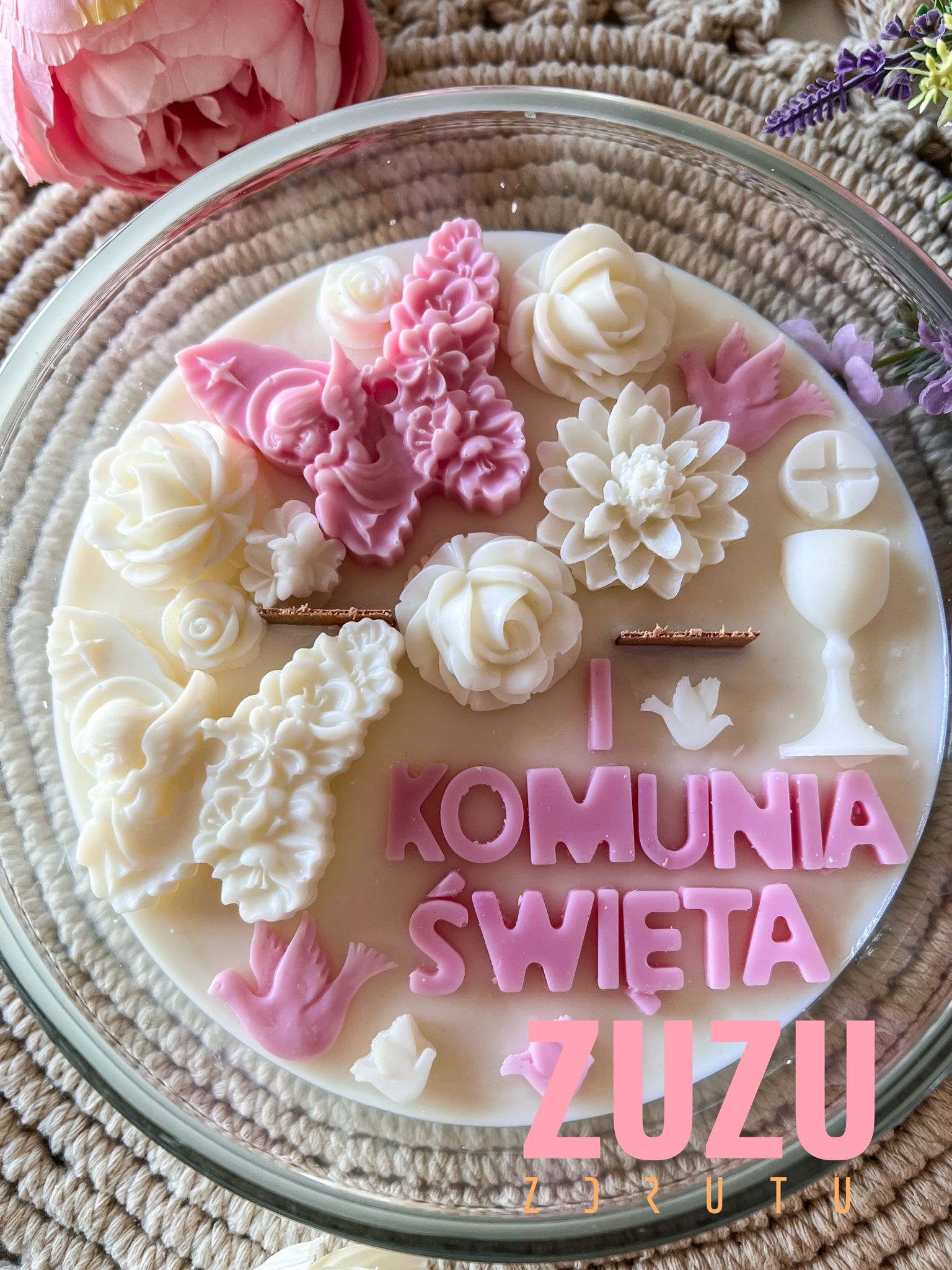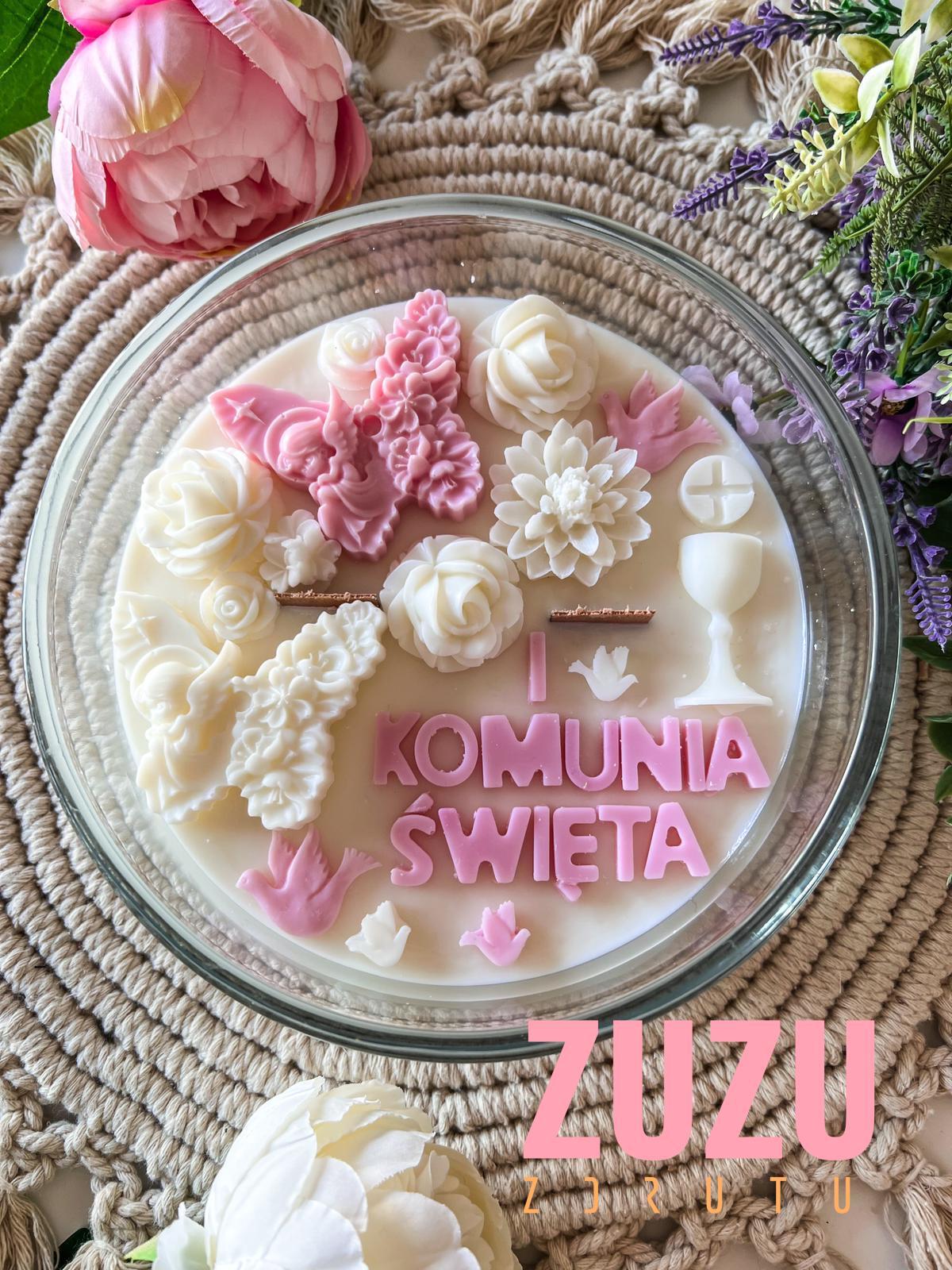DUŻA ŚWIECA NA PIERWSZĄ KOMUNIĘ SWIĘTĄ RÓŻ