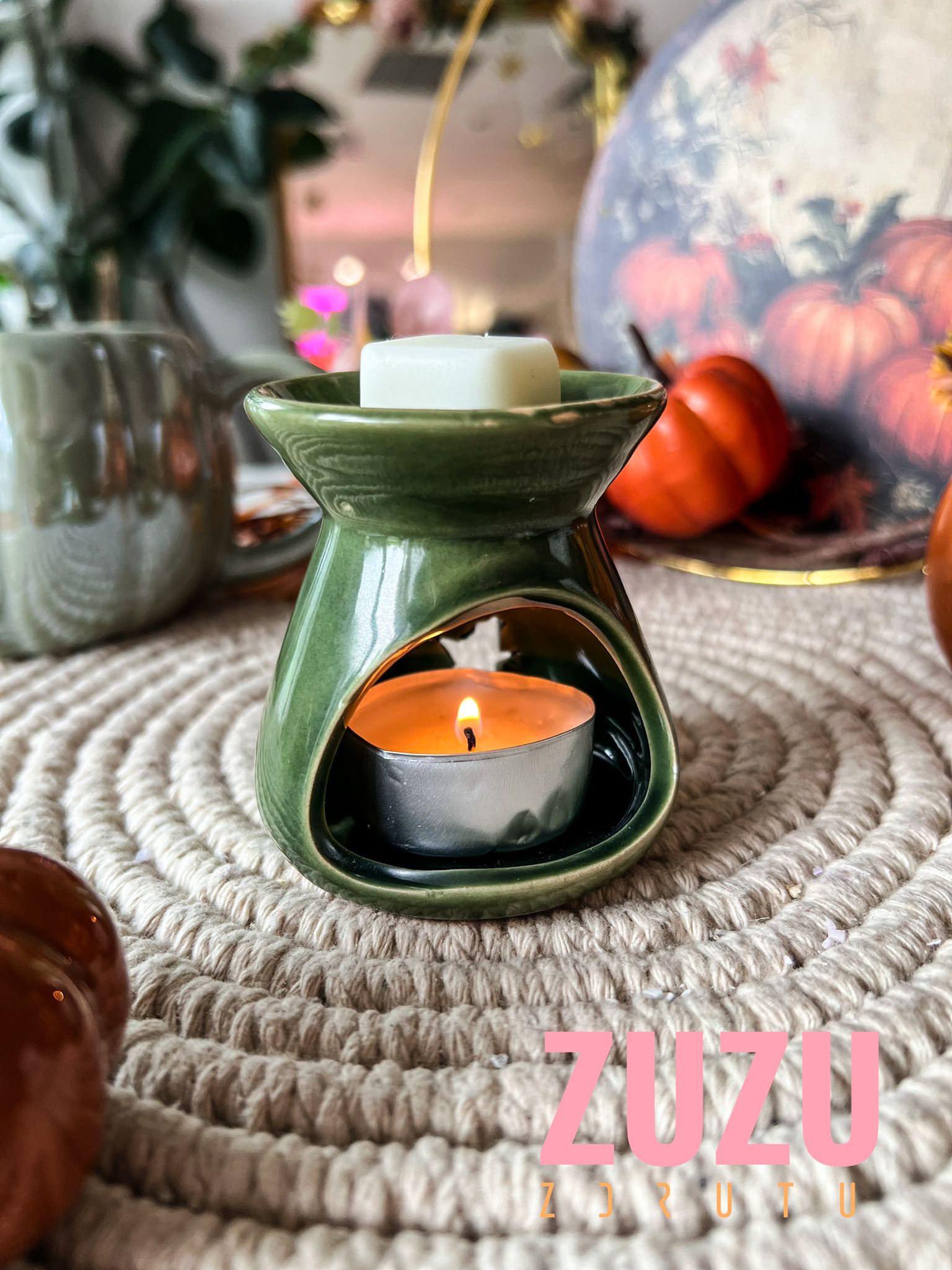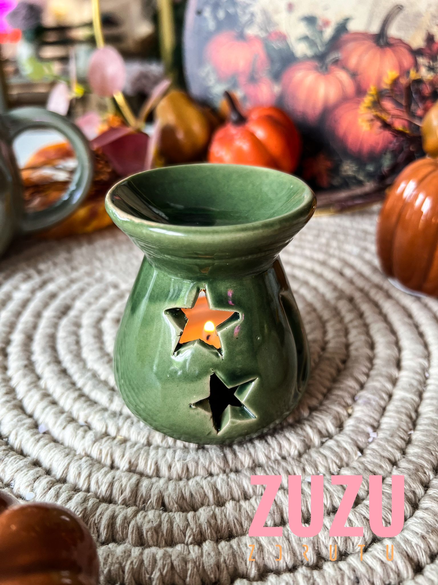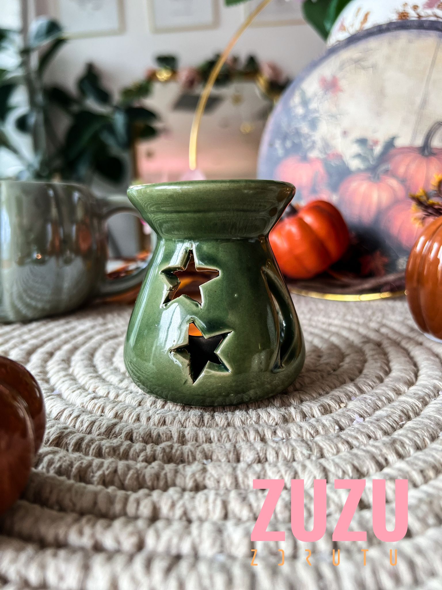 Ceramiczny kominek w odcieniu głębokiej zieleni z gwiazdkowymi wycięciami to idealny dodatek do jesiennego wieczoru. Kompaktowy, stylowy i pasujący do każdego wnętrza – stworzony z myślą o Twoich ulubionych woskach zapachowych.