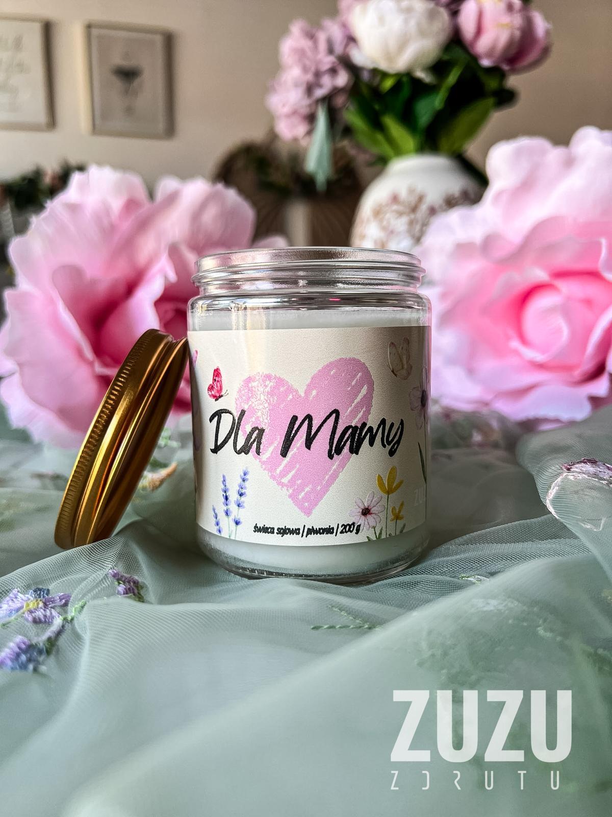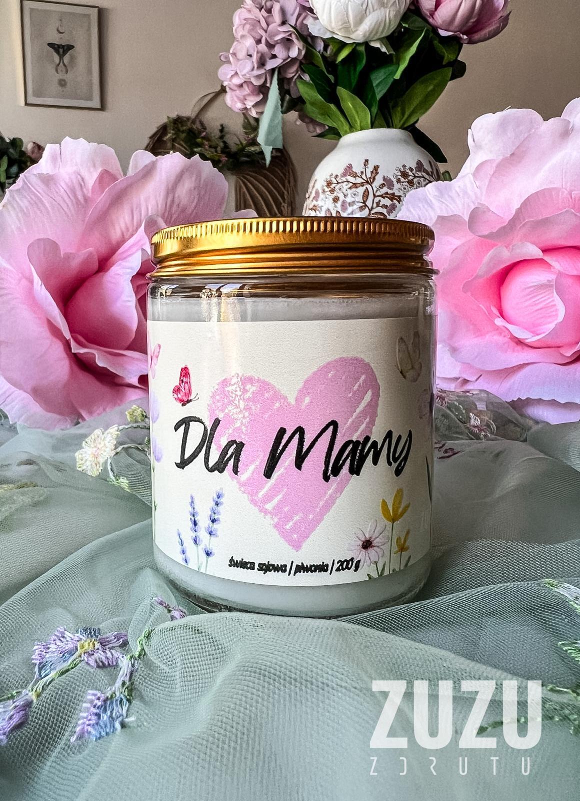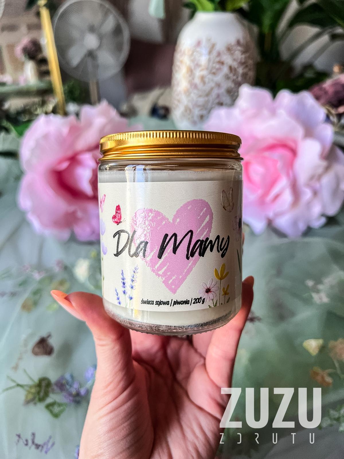 Ta świeca sojowa w słoiczku piwonia powstała z myślą o mamach, dlatego łączy elegancję, delikatność oraz wyjątkowy zapach. Już na pierwszy rzut oka przyciąga subtelna etykieta z sercem i napisem „Dla Mamy”, która nadaje całości wyjątkowego charakteru.
