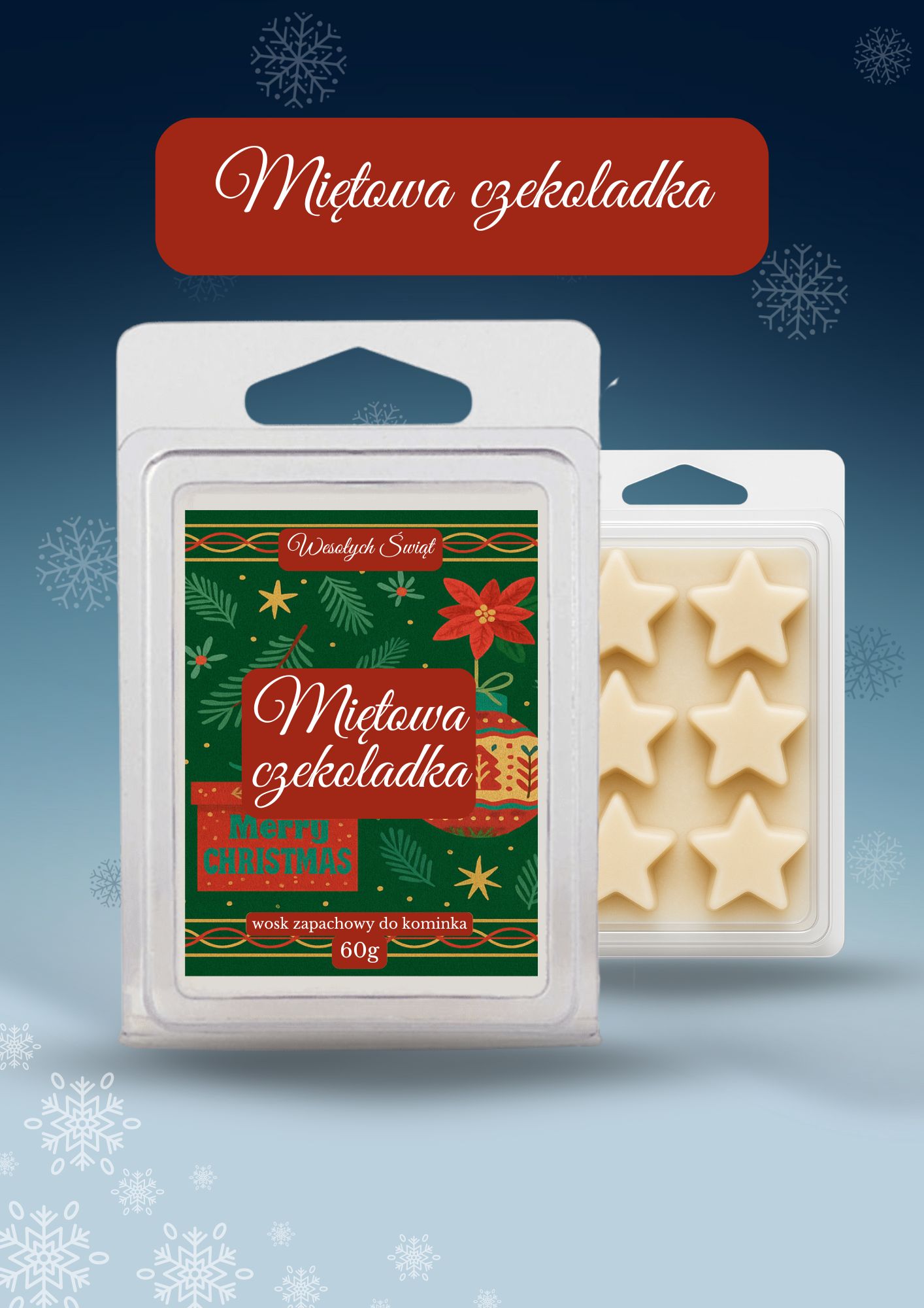 Wosk zapachowy Miętowa czekoladka – to zimowy klasyk z nowej kolekcji – pachnie jak świąteczna czekolada z nutą mięty! Etykieta pełna bożonarodzeniowych ozdób przyciąga wzrok, a świeżo-słodki aromat otuli Cię w mroźne wieczory. Wysyłamy w 1 dzień roboczy