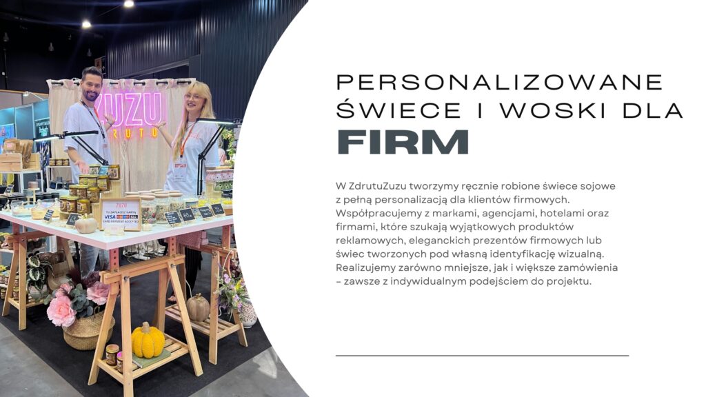 W ZdrutuZuzu tworzymy ręcznie robione świece sojowe z pełną personalizacją dla klientów firmowych. Współpracujemy z markami, agencjami, hotelami oraz firmami, które szukają wyjątkowych produktów reklamowych, eleganckich prezentów firmowych lub świec tworzonych pod własną identyfikację wizualną. Realizujemy zarówno mniejsze, jak i większe zamówienia – zawsze z indywidualnym podejściem do projektu.